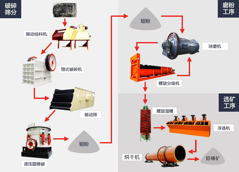 大塊的鉬礦石經(jīng)料倉(cāng)由振動(dòng)給料機(jī)均勻地送進(jìn)顎式破碎機(jī)進(jìn)行粗碎;粗碎后的鉬礦石經(jīng)過(guò)振動(dòng)篩篩分后,由皮帶輸送機(jī)送到液壓圓錐式破碎機(jī)進(jìn)行細(xì)碎;